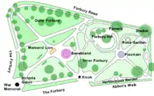 Forbury Gardens is a public park in the town of Reading in the English county of Berkshire. The park is on the site of the outer court of Reading Abbey, which was in front of the Abbey Church. The site was formerly known as the Forbury, and one of the roads flanking the current gardens is still known as The Forbury. Fairs were held on the site three times a year until the 19th century.
