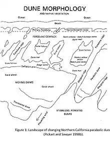 A foredune is a dune ridge that runs parallel to the shore of an ocean, lake, bay, or estuary. Foredunes consist of sand deposited by wind on a vegetated part of the shore. Foredunes can be classified generally as incipient or established.[1]