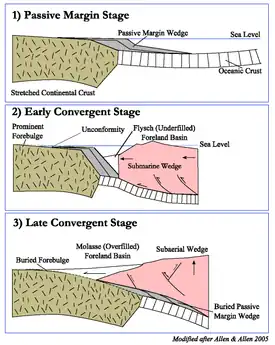 The plate tectonic evolution of a peripheral foreland basin involves three general stages. First, the passive margin stage with orogenic loading of previously stretched continental margin during the early stages of convergence. Second, the "early convergence stage defined by deep water conditions", and lastly a "later convergent stage during which a subaerial wedge is flanked with terrestrial or shallow marine foreland basins".[2]