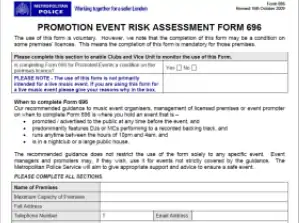 - "Form 696 - Promotion / Event Risk Assessment" (MS Word). Metropolitan Police. Retrieved 21 March 2011.