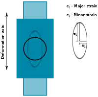 The semi-axes of the ellipse formed in this circle allow for the measurement of relative strain in two primary directions, known as the major and minor directions, which correspond to the major and minor semi-axes of the ellipse. Under the assumption of path independent strain, the relative strains will reach a critical value at which deformations occur. Through repeated measurements, the shape of the curve can be obtained experimentally. Alternately, a formability limit diagram can be generated by mapping the shape of a failure criterion into the formability limit domain. [3] How ever the diagram is obtained, the resultant diagram provides a tool for the determination as to whether a given cold forming process will result in failure or not. Such information is critical in the design of forming processes, and is therefore fundamental to the design of sheet metal forming processes. Through the establishment of forming limit diagrams for a range of alloys, the forming process and alloy behavior can be matched at the metalworking design time by the process engineer.