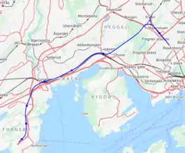The proposed tram-train route would run in a new tramway line from Fornebu to Lysaker. There it would connect to the Drammen Line from Lysaker Station to Skøyen Station. At the latter site it would instead connect to the Skøyen Line of the tramway via Bygdøy allé and run to the city center and Jernbanetorget. The line was proposed extended eastwards partially along the Trunk Line and partially along a new light rail route via Akershus University Hospital to Lillestrøm and Kjeller in Skedsmo.[57] The line from Lysaker to Fornebu was estimated to cost 223 million krone, and a total cost of 334 million to reach the city center.[58]