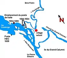In the late 17th century the site was occupied, perhaps intermittently, by members of the d'Ailleboust family, who used "sieur de Coulonge" as a title. Accounts differ: the Commission de toponymie du Québec mentions Nicholas d'Ailleboust de Manthet, who wintered in that location in 1694;[1] Elizabeth Browne Losey says it was founded by the d'Ailleboust family 'as early as 1650'.[4] With the fall of New France it was abandoned.