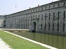Pea Patch Island emerged as a mud bank in the Delaware River in the 18th century. According to folklore, the island received its name after a ship full of peas ran aground on it, spilling its contents and leading to a growth of the plant on the island.[1] By 1814, the island had grown sufficiently large for the construction of Fort Delaware. The original wood structure was replaced by the current brick and concrete one in 1859.[2] During the American Civil War, Fort Delaware was used by the Union as a camp for Confederate prisoners, in particular those captured in 1863 at the Battle of Gettysburg.[2] Many of the prisoners who died at the fort are buried at nearby Finns Point National Cemetery in New Jersey.