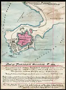Arriving with three ships under Captain Christopher Newport, Captain John Smith and the colonists of the Virginia Company established the settlement of Jamestown and the British Colony of Virginia on the James River in 1607. On their initial exploration, they recognized the strategic importance of the site at Old Point Comfort for purposes of coastal defense. They initially built Fort Algernourne (1609–1622) at the location of the present Fort Monroe. It was renamed the Point Comfort Fort in 1612.[7] It is assumed to have been a triangular stockade, based on the fort at Jamestown. Other small forts known as Fort Henry and Fort Charles were built nearby in 1610 to protect the Kecoughtan settlement.[13] Fort Algernourne fell into disuse after 1622.[7]