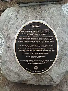 The Victoria Park Cemetery was established circa 1896 by the Methodist church and is located on a hill overlooking the river. It is the second of six cemeteries established in the settlement. It contains approximately 100 recognizable graves from both Native and Settler communities, likely including victims of an 1870 smallpox epidemic.[18] It was restored and rededicated in 1999.[16]