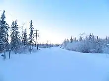 Fort Yukon village street on the Winter Solstice, before sunrise at 11:30 am.