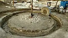 The gates of medieval Indian forts were highly decorated.[9] Two distinct styles are seen. The Hindu style with a lintel and the Mughal style with an arch. Gates in Indian forts were often high and wide to allow elephants to pass.[10] Often they had rows of sharp, stout iron spikes to dissuade an attacking army from using elephants to break down the gates.[11] Such a gate with spikes can be seen on the Shaniwarwada fort, Pune. The walls of the forts were often looked higher from the outside than the inside as the forts made use of the natural rock formations on hills. This not only gave an illusion of greater height but also lead to the lower walls of the fort to be entirely made up of natural rock providing almost a perfect defense against the use of a battering ram or war elephants to tear down the walls.[12] The main gate to the forts was located mostly facing north direction, this was to avoid its deterioration by the rains, winds and the sun.