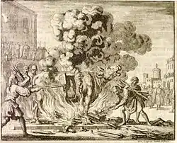 This square was possibly part of Constantine the Great's original city plan design;[1] like the other fora of Constantinople, it was certainly built sometime in the 4th century.[1] The name of the square originated from a large, hollow bronze statue representing the head of an ox.[1][2] The statue, brought to Constantinople from Pergamum in Asia Minor, was used both as a furnace and a device implementing the brazen bull torture: people were closed inside the ox, which then was heated until they suffocated and burned.[1][2] During the first persecution of Christians in Asia Minor under Emperor Domitian (r. 81–96) the Ox, still in Pergamum, was used to execute Saint Antipas.[2] According to the Patrologia Latina, in the reign of Julian the Apostate (r. 361–363) many Christians were burned inside the Bull, at that time already moved to Constantinople.[3] In 562 the Forum, at that time surrounded by warehouses and workshops, burned down.[1] The body of the usurper Phocas (r. 602–610) was also incinerated in the ox's head following his deposition.[1][3] According to some sources,[3] Emperor Heraclius (r. 610–641) melted the statue to mint coins needed to pay his army for his war against the Persians. However, this is not certain since executions using the Ox continue to be attested after Heraclius's reign, for example, when Justinian II (r.685-695; 705–711) let burn in the Ox the two Patricians Theodoros and Stephanos, both involved in a failed plot against him.[3] The same Emperor enlarged and adorned the square.[4] During the Byzantine Iconoclasm, Saint Theodosia (d. 729) and Saint Andrew of Crete (d. 766), both defenders of icon veneration, were executed in the square.[3] The former was executed by having a ram's horn hammered through her neck.[5]