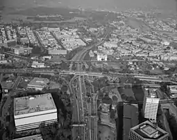 ![]() Four Level Interchange of Arroyo Seco Parkway, Harbor Freeway, Santa Ana Freeway and Hollywood Freeway, looking northeast in January 1999 | |