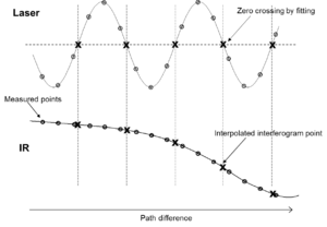 The interferogram is converted to a spectrum by Fourier transformation. This requires it to be stored in digital form as a series of values at equal intervals of the path difference between the two beams. To measure the path difference a laser beam is sent through the interferometer, generating a sinusoidal signal where the separation between successive maxima is equal to the wavelength of the laser (typically a 633 nm HeNe laser is used). This can trigger an analog-to-digital converter to measure the IR signal each time the laser signal passes through zero. Alternatively, the laser and IR signals can be measured synchronously at smaller intervals with the IR signal at points corresponding to the laser signal zero crossing being determined by interpolation.[5] This approach allows the use of analog-to-digital converters that are more accurate and precise than converters that can be triggered, resulting in lower noise.