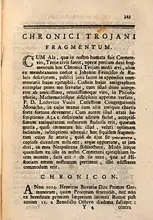 There is no surviving manuscript of the Chronicle. It survives only in printed form.[1] This shows numerous copying errors and other signs of a complicated transmission and possible editing.[2] The earliest copy is the edition included by Alessio Aurelio Pelliccia in his De Christianae Ecclesiae primae, mediae et novissimae aetatis Politia, printed in 1779 and again in 1782. This edition was based on a parchment codex copied by Giovanni Francesco Rossi in the 16th century and given to Pelliccia by his friend Lodovico Vuolo along with a trove of old documents. Rossi was also the source of the only known manuscript copy of the Annales of Lupus Protospatharius, also now lost.[1] According to Pelliccia, the Chronicle was a mere "fragment" in the copy he received. The title he gave it, Chronici Trojani fragmentum, means "fragment of a Troian chronicle". The text as it stands is incomplete and disorganized.[3]