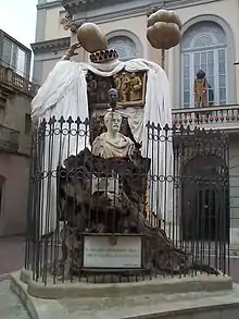 At the end of the Spanish Civil War he went into exile in Prada de Conflent under the hospitality of Pablo Casals (1939), and moved later to the Résidence des Intellectuels Catalans in Montpellier, where he met the writer and scientist Alexandre Deulofeu, and discoursed before young intellectuals such as the critic art Alexandre Cirici Pellicer, the politician Heribert Barrera and Salvador Dalí. Dalí was especially enthralled with Pujols' philosophy: in 1960, he executed an oil painting titled Hyparxiological Sky, and in 1974 published a book, Pujols per Dalí, dedicated to his many conversations with Pujols.[2] Finally, Dalí erected a monument to Francesc Pujols outside the entrance to the Dalí Theatre and Museum in Figueres, Catalonia.