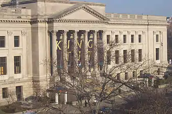 The institute's original building at 15 South 7th Street, later the home of the (now-defunct) Atwater Kent Museum, eventually proved too small for the institute's research, educational programs, and library. The Institute moved into its current home on the Benjamin Franklin Parkway, near the intersection with 20th Street, in 1934. The new facility was intended from the start to educate visitors through hand-on interactions with exhibits: "Visitors to this museum would be encouraged to touch, handle, and operate the exhibits in order to learn how things work."[7] Funds to build the new Institute and Franklin Memorial came from the Poor Richard Club, the City Board of Trust, the Benjamin Franklin Memorial, Inc., and the Franklin Institute. John T. Windrim's original design was a completely square building surrounding the Benjamin Franklin Statue, which had yet to be built. Despite the effects of the Great Depression, the Benjamin Franklin Memorial, Inc. raised $5 million between December 1929 and June 1930. Only two of the four wings envisioned by Windrim were built; these face the Parkway and share design elements with other cultural and civic structures around Logan Circle.
