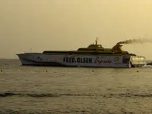 The HSC Bonanza Express is a 96-metre (315 ft) Incat fast catamaran, similar to the Bentago Express and the Bencomo Express, operated by the company on the route between Las Palmas de Gran Canaria and Arrecife (Lanzarote).[4] Introduced in 1999, it was the company's first fast ferry. The Bonanza Express was meant to be sold to Euroferries for a service between Ramsgate and Boulogne, but the deal fell through and the Bonanza Express has found its way back with Fred. Olsen Express in the Canary Islands.[5][6]