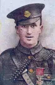 Edwards was born in Queenstown (now named Cobh), County Cork, Ireland. As a boy he attended the Royal Hibernian Military School in Dublin.[1] He was 21 years old, and a private in the 12th Battalion, The Middlesex Regiment (Duke of Cambridge's Own), British Army during the First World War, and was awarded the VC for his deeds on 26 September 1916 in the Battle of Thiepval Ridge at Thiepval, France: part of the line was held up by machine-gun fire and all the officers had become casualties. There was confusion and indication of retirement. Private Edwards, grasping the situation and on his own initiative, dashed out towards the gun, which he knocked out with his bombs. This very gallant act, coupled with great presence of mind and disregard of personal danger, made further advance possible and cleared up a dangerous situation.[2]
