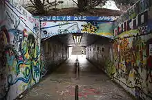 The Free Expression Tunnel is the longest, widest, and most heavily used pedestrian tunnel under the railroad tracks at North Carolina State University in Raleigh, North Carolina (also goes under Yarbrough Drive). The special aspect of the tunnel is that anyone is permitted to decorate its walls, ceiling, and floor. The tunnel connects NCSU's North Campus with the Central Campus and provides the most direct route from The Brickyard to the Central Campus residence halls. Clubs, fraternities, sororities, and other organizations often paint the tunnel to promote events and amateur artists paint to express themselves and to promote freedom of speech. A retaining wall just outside the tunnel's south entrance is also open for free expression. The "service tunnel" itself was constructed in 1939 as a Public Works Administration project. The tunnel was first painted in 1968 when it was painted red and white to celebrate the military veterans of North Carolina