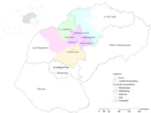 The discovery of the reef led to the establishment of the city of Welkom and the town of Riebeeckstad, while neighbouring towns such as Odendalsrus, Allanridge and Virginia enjoyed prolonged growth.[16] Water was supplied to the region from the Vaal Dam and new roads and railway lines were laid in order to service it.[17] The following mines were established: Beatrix, Erfdeel-Dankbaarheid, Free State Geduld, Jeanette, Loraine, Oryx, President Brand, President Steyn, St. Helena, Welkom, Western Holdings.[17]
