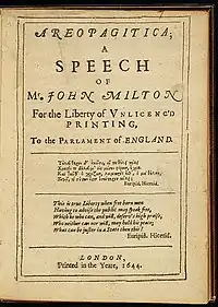 The notion that the expression of dissent or subversive views should be tolerated, not censured or punished by law, developed alongside the rise of printing and the press. Areopagitica, published in 1644, was John Milton's response to the Parliament of England's re-introduction of government licensing of printers, hence publishers.[75] Church authorities had previously ensured that Milton's essay on the right to divorce was refused a license for publication. In Areopagitica, published without a license,[76] Milton made an impassioned plea for freedom of expression and toleration of falsehood,[75] stating: