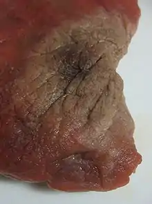 Freezer burn is a condition that occurs when frozen food has been damaged by dehydration and oxidation due to air reaching the food.[1] It is generally caused by food not being securely wrapped in air-tight packaging.