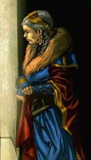 An Asgardian, she is both Queen of Asgard, and the Asgardian gods, the wife of Odin, the step-mother of Thor, the biological mother of Balder, and the adoptive mother of Loki. She is also sometimes described to be a Vanir goddess, as opposed to her husband, who is of the Aesir tribe.[2] She is also the one responsible for casting the spells on Balder to protect him from mortal harm. When Surtur the fire demon threatens all the known realms, Frigga is assigned the guardianship of the children of Asgard. They retreat to a hostel deep in the wintry wilderness of Asgard. Though Frigga does not know it, she is assisted in her guarding by Tiwaz, the great-grandfather of Thor.[3] After Odin and Surtur vanish at the end of the battle, Frigga organizes an 'Althing', where all of Asgard will choose a new ruler.[4] The result is that Balder is chosen as the new ruler.