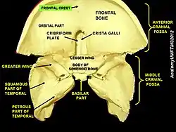The frontal crest is a ridge on the internal surface of the squamous part of the frontal bone formed by the inferior convergence of the two edges of the sagittal sulcus. The frontal crest gives attachment to the falx cerebri.[1]