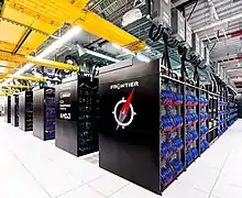 Hewlett Packard Enterprise Frontier, or OLCF-5, is the world's first and fastest exascale supercomputer, hosted at the Oak Ridge Leadership Computing Facility (OLCF) in Tennessee, United States and first operational in 2022. It is based on the Cray EX and is the successor to Summit (OLCF-4). As of March 2023, Frontier is the world's fastest supercomputer. Frontier achieved an Rmax of 1.102 exaFLOPS, which is 1.102 quintillion operations per second, using AMD CPUs and GPUs.[2][3][4][5][6] Measured at 62.68 gigaflops/watt, Frontier topped the Green500 list for most efficient supercomputer,[6] until it was dethroned (in efficiency) by Flatiron Institute's Henri supercomputer in November 2022.[7]