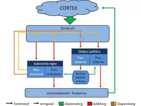 Frontostriatal circuits are neural pathways that connect frontal lobe regions with the basal ganglia (striatum) that mediate motor, cognitive, and behavioural functions within the brain.[1] They receive inputs from dopaminergic, serotonergic, noradrenergic, and cholinergic cell groups that modulate information processing.[2] Frontostriatal circuits are part of the executive functions. Executive functions include the following: selection and perception of important information, manipulation of information in working memory, planning and organization, behavioral control, adaptation to changes, and decision making.[3] These circuits are involved in neurodegenerative disorders such as Alzheimer's disease and Parkinson's disease as well as neuropsychiatric disorders including schizophrenia, depression, obsessive compulsive disorder (OCD), and in neurodevelopmental disorder such as attention-deficit hyperactivity disorder (ADHD).[3][4][5]