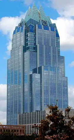 The Frost Bank Tower was designed by Duda/Paine Architects, LLP and HKS, Inc. It carries the highest logo in the city at 420 ft (128 m). This advertises the San Antonio–based Frost Bank, whose Austin headquarters and insurance division are in the building.[7] Tenants in the building besides Frost Bank include the Austin offices of Morgan Stanley, Ernst & Young, and PIMCO. The silvery blue color glass facade was first used on the Reuters Building in New York City.[7] Cousins sold the building in 2006 to EQ Office for $188 million before the building was sold to Thomas Properties Group the same year. In 2013, ownership of the building transferred to Parkway Properties. The building is currently owned by Endeavor Real Estate Group.