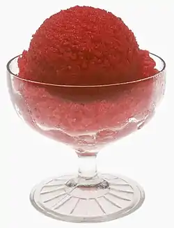 Frozen dessert is a dessert made by freezing liquids, semi-solids, and sometimes solids. They may be based on flavored water (shave ice, ice pops, sorbet, snow cones), on fruit purées (such as sorbet), on milk and cream (most ice creams, sundae, sherbet), on custard (frozen custard and some ice creams), on mousse (semifreddo), and others. It is sometimes sold as ice-cream in South Asia and other countries.