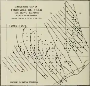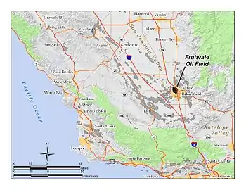 The Fruitvale Oil Field is a large oil and gas field in the southern San Joaquin Valley, California, within and just northwest of the city of Bakersfield, along and north of the Kern River. It is one of the few oil fields in the California Central Valley which is mostly surrounded by a heavily populated area. Discovered in 1928, and with a cumulative total recovery of more than 124 million barrels (19,700,000 m3) of oil at the end of 2006, it is 41st in size among California oil fields, and according to the California Department of Oil, Gas, and Geothermal Resources (DOGGR) its total reserve amounts to a little less than ten percent of its original oil.[1]