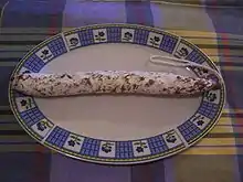 Fuet (Catalan pronunciation: [fuˈɛt], lit. "whip") is a Catalan thin,[1] dry-cured, sausage of pork meat in a pork gut. The most famous is made in the comarca (county) of Osona and is also known as Vic fuet (fuet de Vic, after the city of Vic, capital of Osona).[2] Other places that have long tradition of making it are the city of Olot and the surrounding areas.