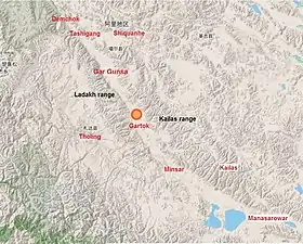 Gar Günsa means the "winter camp".[7][8] The ninth century bilingual text Mahāvyutpatti translated günsa as Sanskrit हैमन्तिकावासः (haimantikāvāsaḥ), literally, the residence of the winter season.[9] Even though Gar Yarsa has acquired the name "Gartok" in popular parlance, officially, "Gartok" consisted of both Gar Günsa and Gar Yarsa (the "summer camp"). The latter is forty miles upstream on Gartang at a higher altitude.[10]