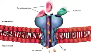 In ionotropic GABAA receptors, binding of GABA molecules to their binding sites in the extracellular part of the receptor triggers opening of a chloride ion-selective pore.[11] The increased chloride conductance drives the membrane potential towards the reversal potential of the Cl¯ ion which is about –75 mV in neurons, inhibiting the firing of new action potentials. This mechanism is responsible for the sedative effects of GABAA allosteric agonists. In addition, activation of GABA receptors lead to the so-called shunting inhibition, which reduces the excitability of the cell independent of the changes in membrane potential.