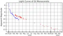 GI Monocerotis, also known as Nova Monocerotis 1918, was a nova that erupted in the constellation Monoceros during 1918. It was discovered by Max Wolf on a photographic plate taken at the Heidelberg Observatory on 4 February 1918. At the time of its discovery, it had a photographic magnitude of 8.5, and had already passed its peak brightness. A search of plates taken at the Harvard College Observatory showed that it had a photographic magnitude of 5.4 on 1 January 1918, so it would have been visible to the naked eye around that time. By March 1918 it had dropped to ninth or tenth magnitude.[5][6] By November 1920 it was a little fainter than 15th magnitude.[7]