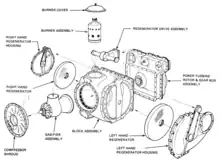 Compared to earlier engines, the turbine inlet temperature was increased again to 1,700 °F (930 °C).[31] The gasifier (compressor) shaft idled at 15,000 RPM and BSFC was 0.45 lb/hp·h. A "power transfer" system was used to harness some of the gasifier turbine to the output shaft; with this engaged, engine braking was available at an effectiveness of two to three times the equivalent effect as using a piston engine. The engine used a single rotating drum regenerator, moved to the top of the engine with a single combustor.[32] With this reconfiguration, GT-309 measured 36 in (910 mm) long, 30 in (760 mm) wide, and 35.5 in (900 mm) high, consuming air at a rate of 4 lb/s (110 kg/min) with a compression ratio of 3.9:1.[18]: 370–371 Whenever the transmission was in gear, the engine operated at a ready-idle speed of 19,300 RPM (gasifier turboshaft) and was capable of accelerating to 32,130 RPM in 2.7 seconds to combat throttle lag.[18]: 371–373 The single regenerator preheated the compressed air from 400 to 1,100 °F (204 to 593 °C), resulting in exhaust gas temperatures of less than 500 °F (260 °C).[18]: 375