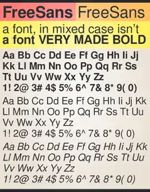 GNU FreeFont (also known as Free UCS Outline Fonts) is a family of free OpenType, TrueType and WOFF vector fonts, implementing as much of the Universal Character Set (UCS) as possible, aside from the very large CJK Asian character set. The project was initiated in 2002 by Primož Peterlin and is now maintained by Steve White.