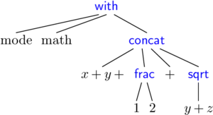 TeXmacs trees are represented in TeXmacs files as strings, and in the TeXmacs editor as the typeset representation of the document together with its interactive behaviour.[20] In the on-screen representation of the TeXmacs tree, the cursor movement represents the movement inside the tree. On disk, three representations of the TeXmacs format exist: a native representation, an XML representation and a representation with Scheme S-expressions; the Scheme representation is useful for the interfacing with Scheme programs.