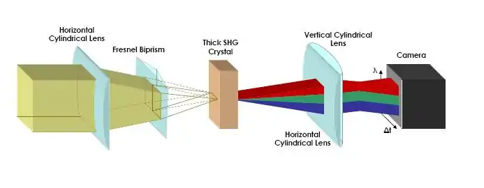 The thick SHG crystal in this setup performs two duties. The two identical beams from the biprism cross in the crystal with a delay that varies in the horizontal direction, which is effectively a self-gating process. The second function of the SHG crystal is to act as the spectrometer by converting vertical incidence angle into wavelength. The limited phase-matching bandwidth of the crystal causes the generated wavelength to vary with the incidence angle. Thus, the initial focus must be tight enough to include the entire spectrum of the pulse. After the SHG crystal, cylindrical lenses are used to image the signal onto a camera with wavelength mapped vertically while the delay is mapped horizontally.[2]