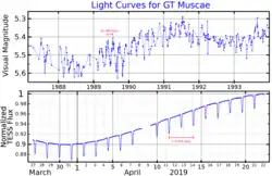 ![]() Light curves for GT Muscae. The upper panel (adapted from Murdoch et al.[1]) shows the long-term variability after a model of the eclipsing binary variability has been removed. The orbital period of HD 101379 is shown in red. The lower panel shows TESS data,[2] in which the eclipses (both primary and secondary) are clearly visible. The orbital period of HD 101380 is shown in red. | |