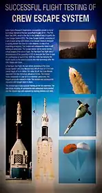 The Indian Space Research Organisation's Pad Abort Test was conducted successfully on 5 July 2018.[66] As of September 2021, Vikram Sarabhai Space Centre (VSSC) was integrating a test vehicle to conduct an uncrewed flight test of Crew Escape System (CES) before the official launch of Gaganyaan mission. The test vehicle was planned be ready by the end of 2021.[67]