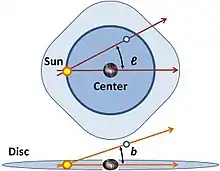 Latitude (symbol b) measures the angle of an object northward of the galactic equator (or midplane) as viewed from Earth. Analogous to terrestrial latitude, galactic latitude is usually measured in degrees (°).