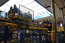 | Trains | 5 trains with a single car. Riders are arranged 2 across in 2 rows for a total of 4 riders per train. |