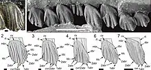 The generic name is derived from "galleon" (a type of large sailing ship) and "saurus" (New Latin from the Greek sauros for lizard), in reference to the appearance of the maxilla to the upturned hull of a galleon. The specific name dorisae was given in recognition of Doris Seegets-Villiers for her geological, palynological, and taphonomic work on the Flat Rocks fossil vertebrate locality. The holotype specimen is NMV P229196, a complete left maxilla with partial dentition. In addition to this specimeen, several other specimens from Flat Rocks were referred to Galleonosaurus. These include: NMV P212845, a partial left maxilla lacking erupted dentition; NMV P208178, a partial left maxilla with erupted dentition; NMV P208113, a worn right maxillary tooth; NMV P208523, worn left maxillary tooth; and NMV P209977, partial left maxilla, lacking erupted dentition. In addition, the specimen NMV P186440, collected from the nearby locality The Caves, was referred to the taxon. It consists of a posterior portion of left maxilla, left palatine, and fragment of left lacrimal.[1]