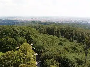 At the summit of the Gallitzinberg is an observation tower which in 1956 replaced an older steel construction that had been erected in 1899 in commemoration of the 50th anniversary of emperor Franz Joseph I's ascendancy to the Austrian throne. Therefore, the present tower is still colloquially known as the Jubiläumswarte (“jubilee tower”). Its topmost platform, 31 meters above ground, offers an impressive panorama of Vienna. On very clear days one can see for more than 60 kilometers, to the Slovak Little Carpathians beyond the city in the East, and to the Schneeberg, Lower Austria's highest mountain, in the South. Next to the tower it is a small facility dedicated to the education of Vienna's schoolchildren in the fundamentals of forest biology. Also in the immediate vicinity, but with few remains visible above ground, is the legacy of the Gaugefechtsstand Wien, a Wehrmacht command and control bunker which during the later years of World War II coordinated air alarms and aerial defense for Vienna and its surroundings.[3]