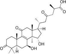 Ganoderic acids are a class of closely related triterpenoids (derivatives from lanosterol) found in Ganoderma mushrooms. For thousands of years, the fruiting bodies of Ganoderma fungi have been used in traditional medicines in East Asia.[1][2] Consequently, there have been efforts to identify the chemical constituents that may be responsible for the putative pharmacological effects. The two most well described ganoderic acids out of the many that have been identified and characterized are ganoderic acids A and B. Some ganoderic acids have been found to possess biological activities including hepatoprotection,[3] anti-tumor effects,[4] and 5-alpha reductase inhibition.[5]