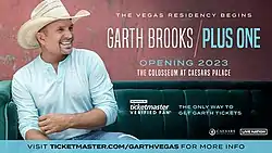 Garth Brooks/Plus ONE is an upcoming concert residency by American country pop singer Garth Brooks at The Colosseum at Caesars Palace in Las Vegas. It is scheduled to begin on May 18, 2023 and will consist of 27 total shows. Brooks will present the performances both in an intimate, one-man show format, and also with his band present on select songs throughout the set.[1][2]