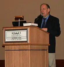 Giddins speaking at an American Library Association conference in Chicago, 2009.