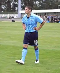 His debut came the following season when Grays were promoted into the newly formed Conference South, helping them to win the league by scoring 12 goals in 30 league appearances.[4][5] He started for Grays in the 2004–05 FA Trophy Final against Hucknall Town, but was substituted towards the end of extra-time. The match went to penalties and Grays won the shoot-out 6–5.[11]