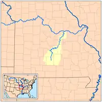 The headwaters of the Gasconade are in the southeastern corner of Webster County northeast of Seymour, Missouri where it drains the eastern margin of the Springfield Plateau at approximately 37°11′54″N 92°41′44″W.[9] The river joins the Missouri River at the city of Gasconade at 38°40′28″N 91°32′55″W.[10] The river follows a meandering course through the Ordovician age dolomite and sandstone bedrock of the Ozark Salem Plateau creating spectacular bluffs and incised meanders along the way.[11] Numerous springs and caves occur within the drainage area and along the river course. Significant tributaries include the Osage Fork of Webster and Laclede counties and Roubidoux Creek and Big Piney River of Texas and Pulaski counties. The Roubidoux and Big Piney flow respectively along the west and east boundaries of Fort Leonard Wood which lies a short distance south and east of the Gasconade.